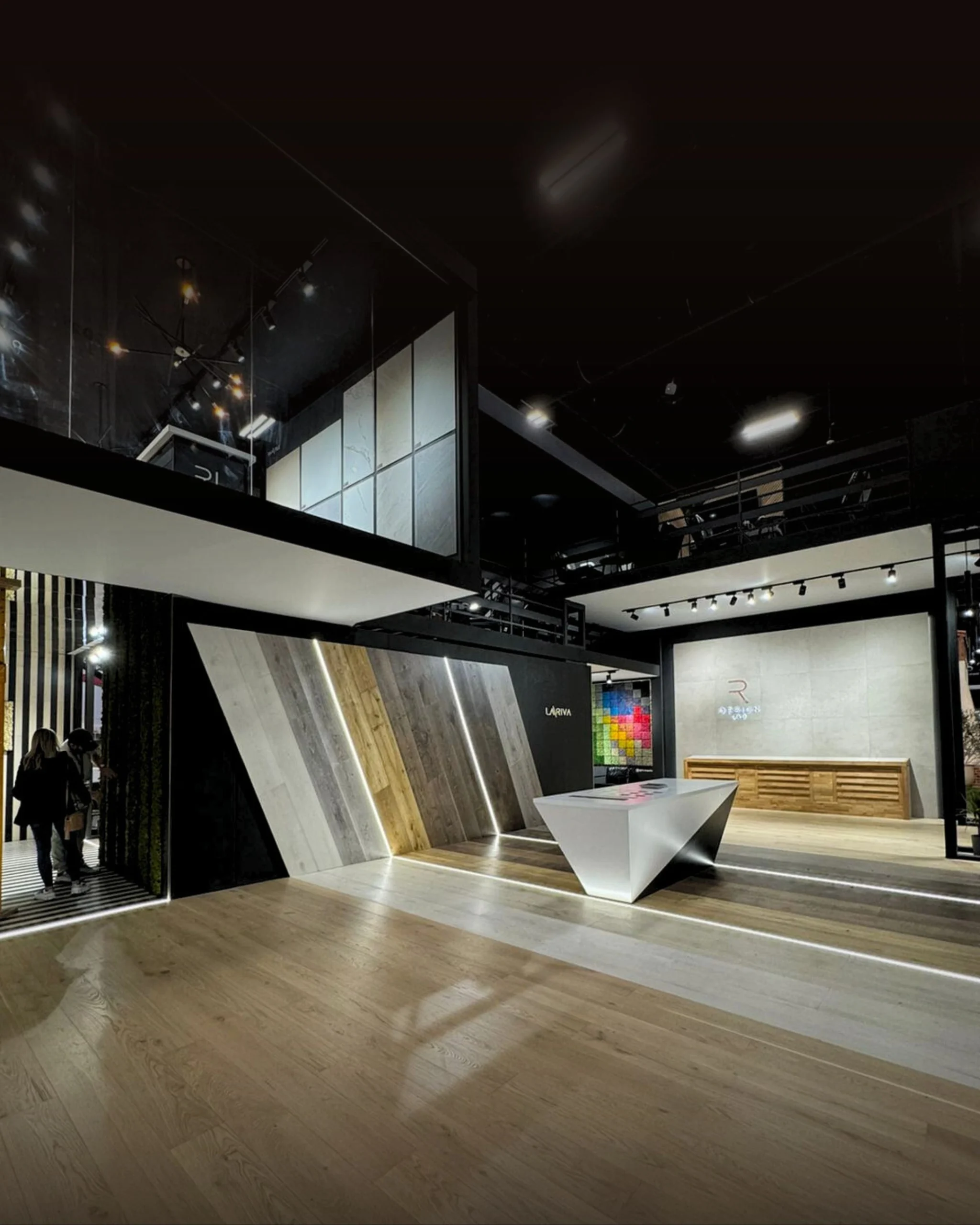 Four large-scale displays capture the essence of RIVA Spain, each presenting a curated selection on both sides — an invitation to see and touch our products.
